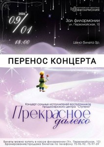 В связи с неблагоприятными погодными условиями концерт сольных исполнителей воспитанников продюсерского центра «Ступени» с программой «Прекрасное далеко» переносится с 9 января на 13 января.