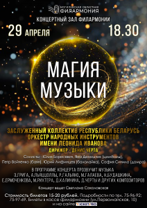 Заслуженный коллектив Республики Беларусь оркестр народных инструментов имени народного артиста Беларуси Леонида Иванова (главный дирижер – Денис Черта) приглашает на концерт "Магия музыки", который состоится 29 апреля в 18:30 в концертном зале филармонии.